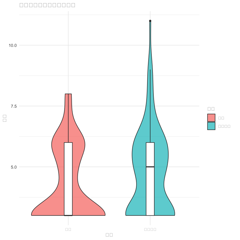 Warning message: “Removed 2 rows containing non-finite outside the scale range (`stat_ydensity()`).” Warning message: “Removed 2 rows containing non-finite outside the scale range (`stat_boxplot()`).” Warning message: “Removed 3 rows containing non-finite outside the scale range (`stat_boxplot()`).” Warning message: “Removed 11 rows containing non-finite outside the scale range (`stat_boxplot()`).” Warning message: “Removed 2 rows containing non-finite outside the scale range (`stat_density()`).” Warning message: “Removed 2 rows containing non-finite outside the scale range (`stat_ydensity()`).” Warning message: “Removed 2 rows containing non-finite outside the scale range (`stat_boxplot()`).”